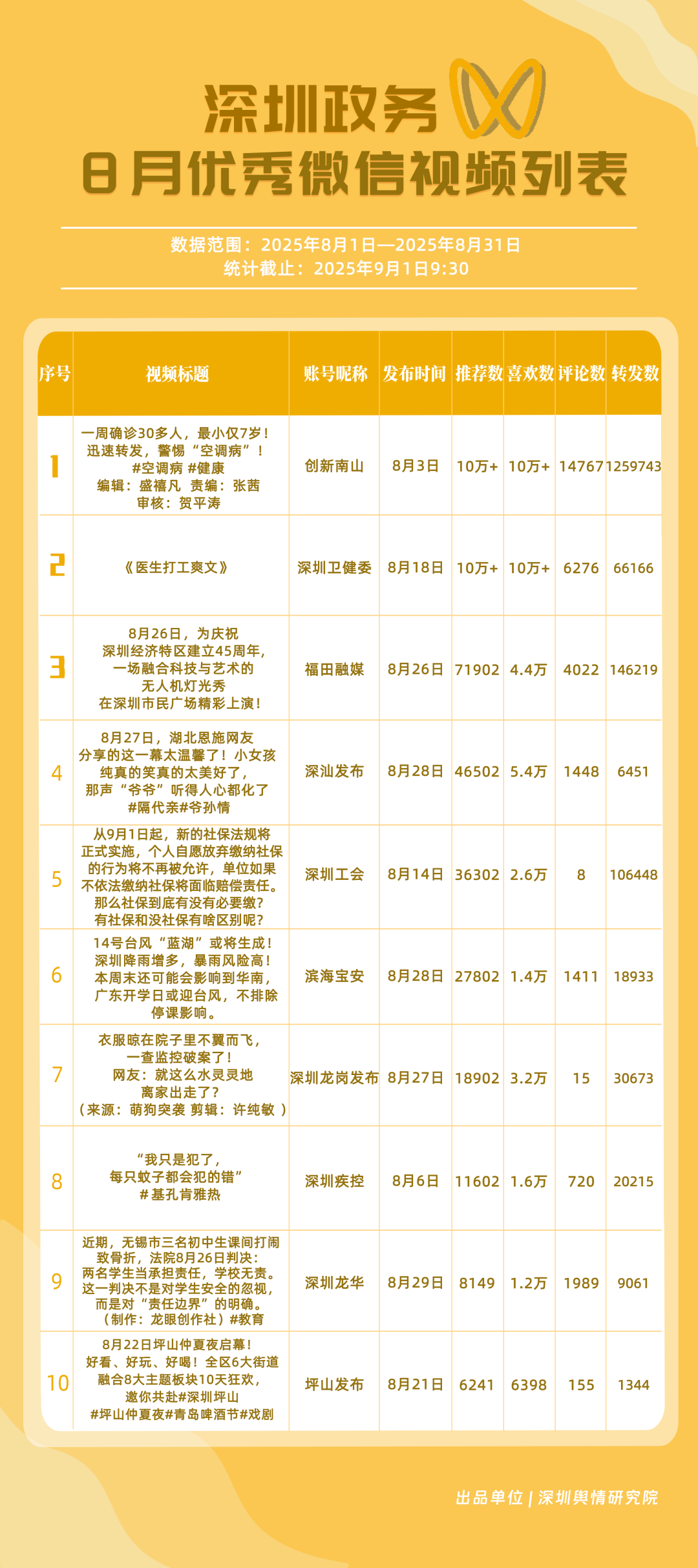 8月,獲得“深圳優(yōu)秀政務微信視頻號”稱號的是“創(chuàng)新南山”“深圳衛(wèi)健委”“深汕發(fā)布”“福田融媒”“深圳龍崗發(fā)布”“濱海寶安”“深圳工會”“深圳龍華”“青春深圳”“深圳天氣”。其中,“創(chuàng)新南山”一視頻提醒市民警惕“空調病”,獲百萬次轉發(fā),賬號憑借該視頻位列榜單第一名;“深圳衛(wèi)健委”視頻“醫(yī)生打工爽文”“傷痛蚊學”等作品在微信視頻號平臺獲得較好數(shù)據(jù),助推其位列榜單第二名;“深汕發(fā)布”在內容互動性上獲得較好成效,單項指標得分達到100分,以92.01的評分位列榜單第三名?!案L锶诿健薄吧钲邶垗彴l(fā)布”等賬號也獲得不錯成績,上榜微信視頻號依托平臺的傳播優(yōu)勢,用簡短視頻呈現(xiàn)各類信息,打造政務宣傳的亮眼名片。