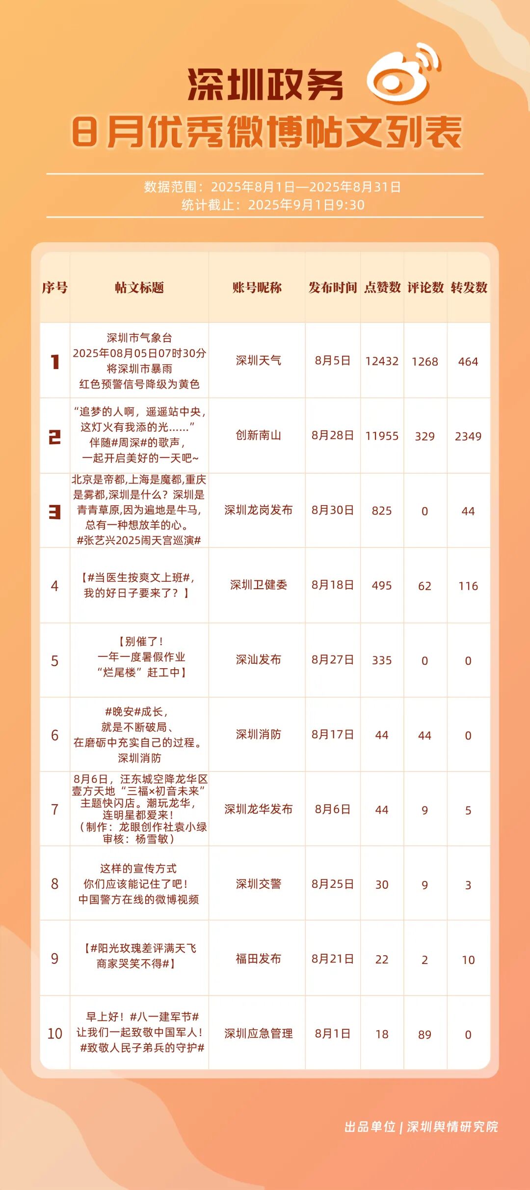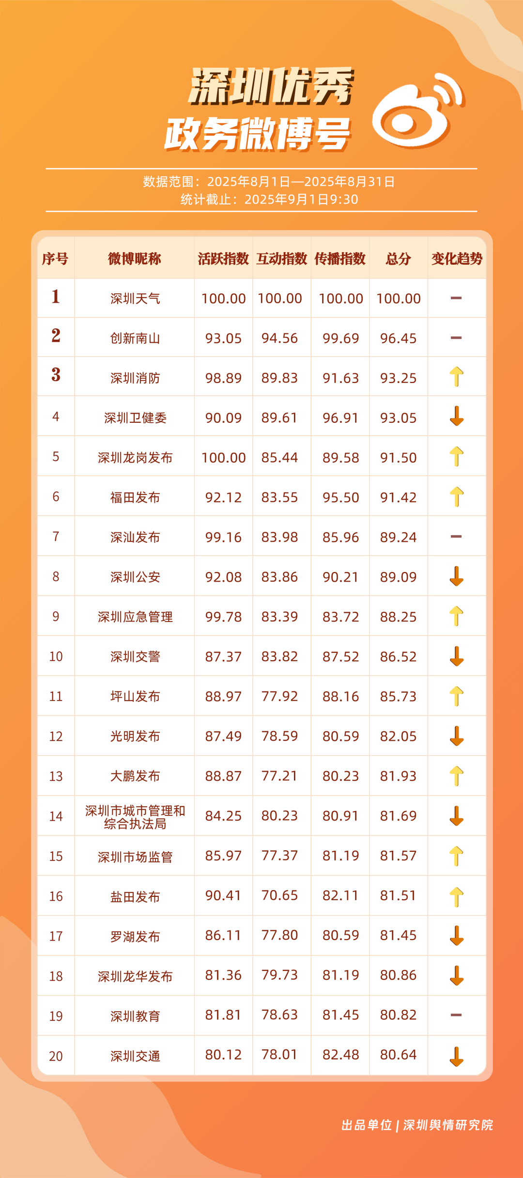 8月,“深圳天氣”“創(chuàng)新南山”“深圳消防”“深圳衛(wèi)健委”“深圳龍崗發(fā)布”“福田發(fā)布”“深汕發(fā)布”“深圳公安”“深圳應急管理”“深圳交警”等20個賬號入選“優(yōu)秀政務微博號”。其中,“深圳天氣”持續(xù)以優(yōu)質內容受到網(wǎng)民肯定,蟬聯(lián)榜首;“創(chuàng)新南山”傳播指數(shù)得分再提升,總分96.45,排名保持在第二位;“深圳消防”積極發(fā)布消防相關內容,以93.25分位列第三。上榜優(yōu)秀政務微博賬號精準把握網(wǎng)民興趣點,內容獨具風采,收獲網(wǎng)民認可,實現(xiàn)了較好的傳播效果。