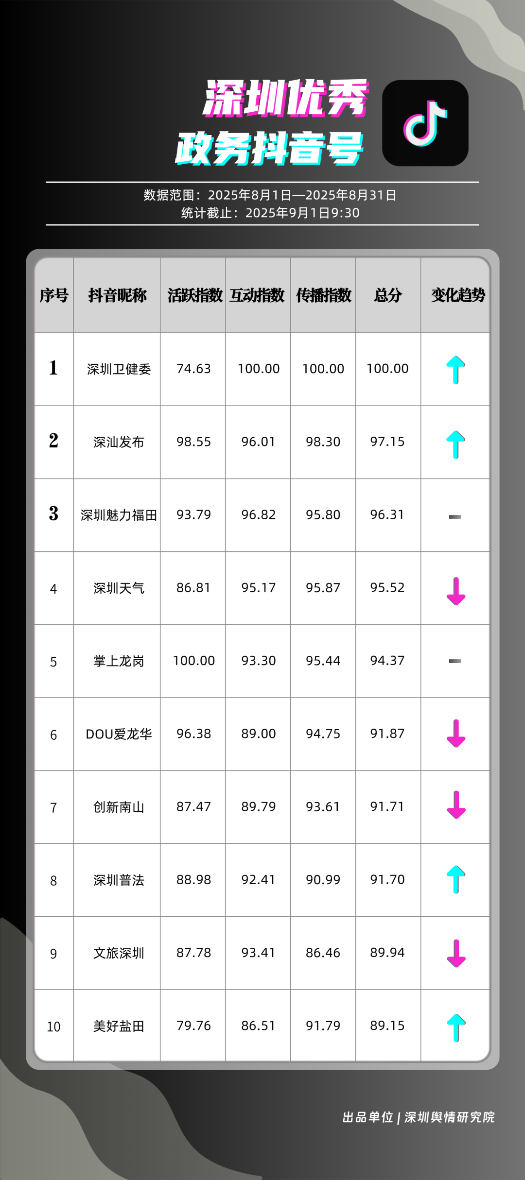 8月,“深圳衛(wèi)健委”“深汕發(fā)布”“深圳魅力福田”“深圳天氣”“掌上龍崗”“DOU愛龍華”“創(chuàng)新南山”“深圳普法”“文旅深圳”“美好鹽田”共10個政務抖音號獲得“優(yōu)秀政務抖音號”稱號。“深圳衛(wèi)健委”內容吸引大量網(wǎng)民關注,4條視頻累計獲得超50萬次點贊,排名從上期的第九名上升至第一名;“深汕發(fā)布”憑借較高的傳播指數(shù)評分,位列第二名,排名有所上升?!吧钲邝攘ΩL铩薄吧钲谔鞖狻钡荣~號緊隨其后,得分均在95分左右。上榜的優(yōu)秀政務抖音號深耕優(yōu)質創(chuàng)作,精準把握網(wǎng)民興趣點,使作品收獲高點贊、高轉發(fā),推動評論區(qū)形成良性互動氛圍,以優(yōu)秀內容提升政務傳播效能。