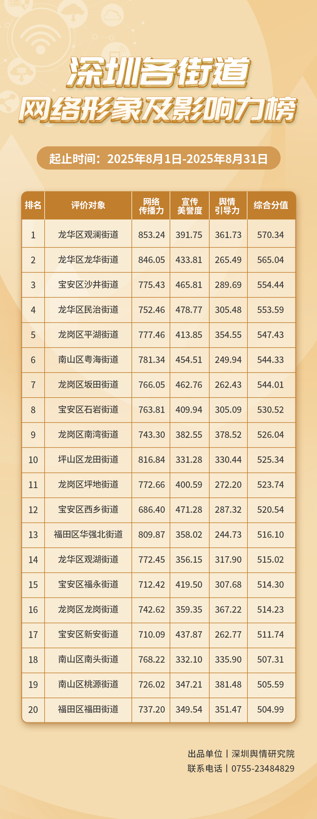 2025年8月,共有20個(gè)街道登上《深圳各街道網(wǎng)絡(luò)形象及影響力榜》,分別是:龍華區(qū)觀瀾街道、龍華區(qū)龍華街道、寶安區(qū)沙井街道、龍華區(qū)民治街道、龍崗區(qū)平湖街道、南山區(qū)粵海街道、龍崗區(qū)坂田街道、寶安區(qū)石巖街道、龍崗區(qū)南灣街道、坪山區(qū)龍?zhí)锝值馈垗弲^(qū)坪地街道、寶安區(qū)西鄉(xiāng)街道、福田區(qū)華強(qiáng)北街道、龍華區(qū)觀湖街道、寶安區(qū)福永街道、龍崗區(qū)龍崗街道、寶安區(qū)新安街道、南山區(qū)南頭街道、南山區(qū)桃源街道、福田區(qū)福田街道。