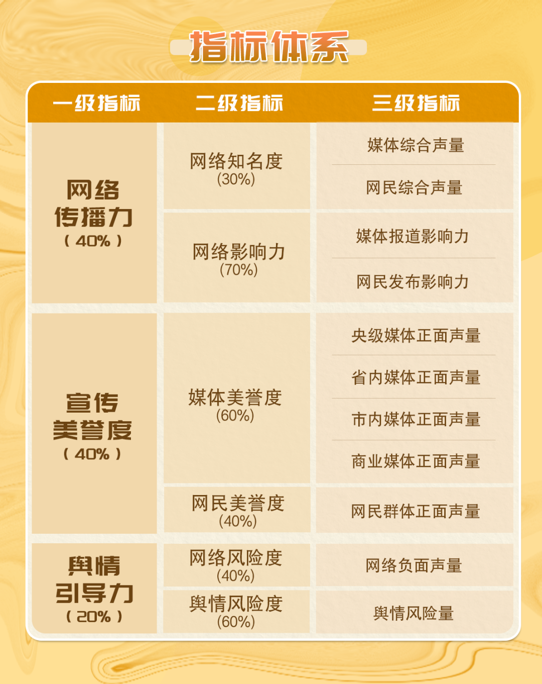 《深圳各街道網(wǎng)絡(luò)形象及影響力榜》具有科學(xué)、可信、量化的指標(biāo)評價(jià)體系,能夠全面客觀地評估各街道的網(wǎng)絡(luò)綜合形象及影響力值。具體指標(biāo)體系如下圖所示↓