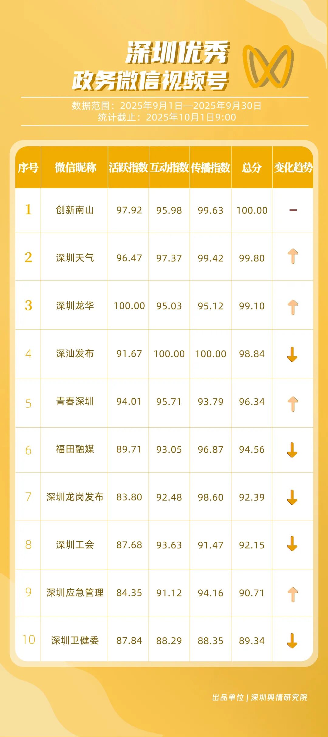 9月,深圳政務(wù)新媒體矩陣持續(xù)優(yōu)化內(nèi)容生態(tài),各單位依托平臺特色深化服務(wù)效能,南山區(qū)、市衛(wèi)生健康委員會、市氣象局(臺)、龍崗區(qū)、福田區(qū)、龍華區(qū)、深汕特別合作區(qū)、市應(yīng)急管理局、中國共產(chǎn)主義青年團深圳市委員會、光明區(qū)的新媒體矩陣入選“深圳優(yōu)秀政務(wù)新媒體矩陣”榜單。9月,南山區(qū)在短視頻平臺表現(xiàn)突出,抖音、微信視頻號平臺均獲滿分;市衛(wèi)生健康委員會輸出深度內(nèi)容,位列榜單第二;市氣象局(臺)新媒體矩陣居于榜單第三,在9月發(fā)布臺風(fēng)相關(guān)天氣提醒,獲得公眾廣泛關(guān)注。此外,龍崗區(qū)、福田區(qū)、龍華區(qū)、深汕特別合作區(qū)新媒體矩陣持續(xù)推出優(yōu)質(zhì)內(nèi)容,共同展現(xiàn)了深圳在塑造現(xiàn)代化形象、提升數(shù)字治理能力上的創(chuàng)新引領(lǐng)作用。