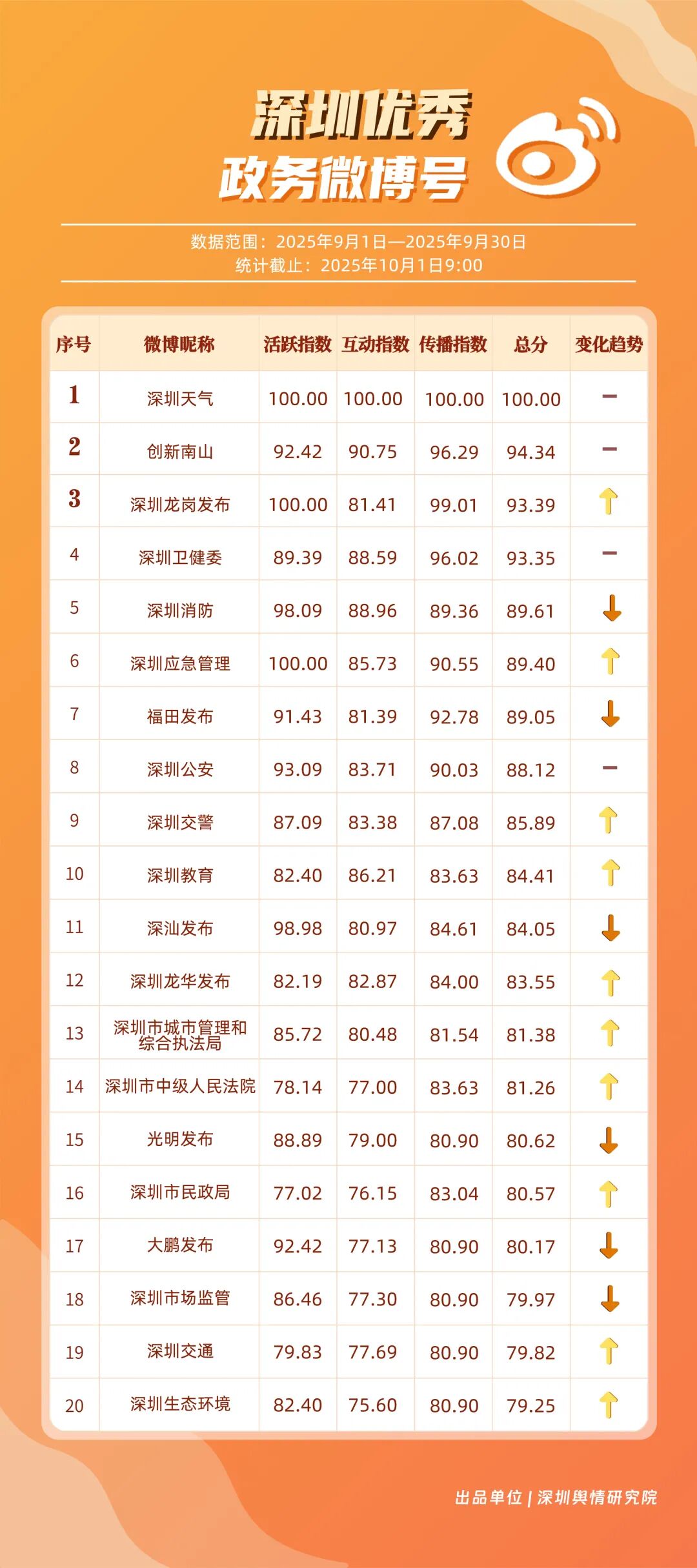 9月,20個賬號入選“優(yōu)秀政務(wù)微博號”榜單,其中包括:“深圳天氣”“創(chuàng)新南山”“深圳龍崗發(fā)布”“深圳衛(wèi)健委”“深圳消防”“深圳應(yīng)急管理”“福田發(fā)布”“深圳公安”“深圳交警”“深圳教育”等。其中,“深圳天氣”蟬聯(lián)榜首,尤其9月出現(xiàn)臺風(fēng)天氣,賬號受關(guān)注度再提升;“創(chuàng)新南山”賬號以多維度內(nèi)容策略實現(xiàn)傳播效能提升,其內(nèi)容中與歌手周深的聯(lián)動也成為一大亮點,獲得了較好傳播效果,以94.34分排名榜單第二;“深圳龍崗發(fā)布”“深圳衛(wèi)健委”兩賬號得分均在93分以上,在區(qū)域宣傳、內(nèi)容科普方向發(fā)力。上榜優(yōu)秀微博賬號展現(xiàn)出較高的內(nèi)容創(chuàng)新能力,以年輕化語態(tài)構(gòu)建傳播體系,形成兼具專業(yè)性與傳播力的優(yōu)秀案例。
