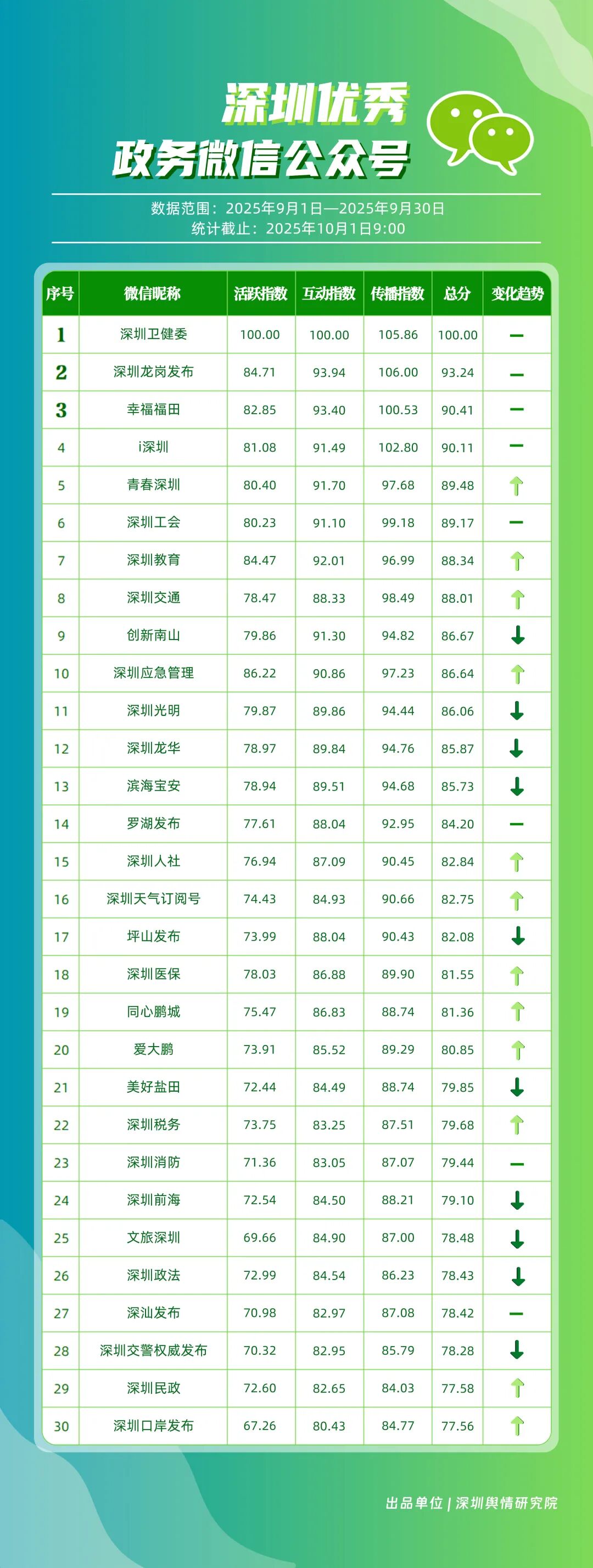 9月,“深圳衛(wèi)健委”“深圳龍崗發(fā)布”“幸福福田”“i深圳”“青春深圳”“深圳工會”“深圳教育”“深圳交通”“創(chuàng)新南山”“深圳應(yīng)急管理”等30個政務(wù)微信公眾號榮登“深圳優(yōu)秀政務(wù)微信公眾號”榜單。9月,“深圳衛(wèi)健委”以總分100.00的成績蟬聯(lián)榜單首位,其憑借突破常規(guī)視角的選題,解讀專業(yè)健康知識,引發(fā)大量網(wǎng)民共鳴,內(nèi)容質(zhì)量與傳播力形成雙向賦能;“深圳龍崗發(fā)布”以總分93.24位居第二,聚焦區(qū)域民生服務(wù)升級等動態(tài),信息觸達率不斷提升;“幸福福田”圍繞商圈經(jīng)濟復(fù)蘇、文化節(jié)慶活動等主題開展系列宣傳,增強區(qū)域活力展示,位列第三;“i深圳”“青春深圳”“深圳工會”等也持續(xù)優(yōu)化賬號內(nèi)容,通過實用信息推送強化政務(wù)服務(wù)定位。