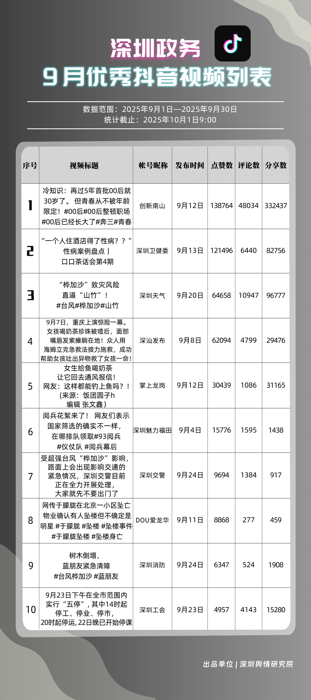 9月,獲得“優(yōu)秀政務(wù)抖音號”稱號的是“創(chuàng)新南山”“深圳天氣”“深圳衛(wèi)健委”“深圳魅力福田”“深汕發(fā)布”“掌上龍崗”“DOU愛龍華”“深圳工會”“青春深圳”“深圳交警”。“創(chuàng)新南山”以一條有關(guān)“青春不被年齡限定”的視頻獲得超34萬次轉(zhuǎn)發(fā),超14萬次點贊,助力其在抖音榜單居于榜首;“深圳天氣”多條臺風(fēng)相關(guān)視頻吸引大量網(wǎng)民關(guān)注、互動,在抖音平臺得分超98分;“深圳衛(wèi)健委”“深圳魅力福田”“深汕發(fā)布”等賬號緊隨其后,得分均在92分以上。上榜的優(yōu)秀政務(wù)抖音號以“有溫度”的敘事表達,將宣傳、服務(wù)內(nèi)容轉(zhuǎn)化為網(wǎng)民喜聞樂見的視頻,收獲高點贊、高轉(zhuǎn)發(fā)的流量實績,更在評論區(qū)形成了良性互動生態(tài),深度運營收獲了較好成果。