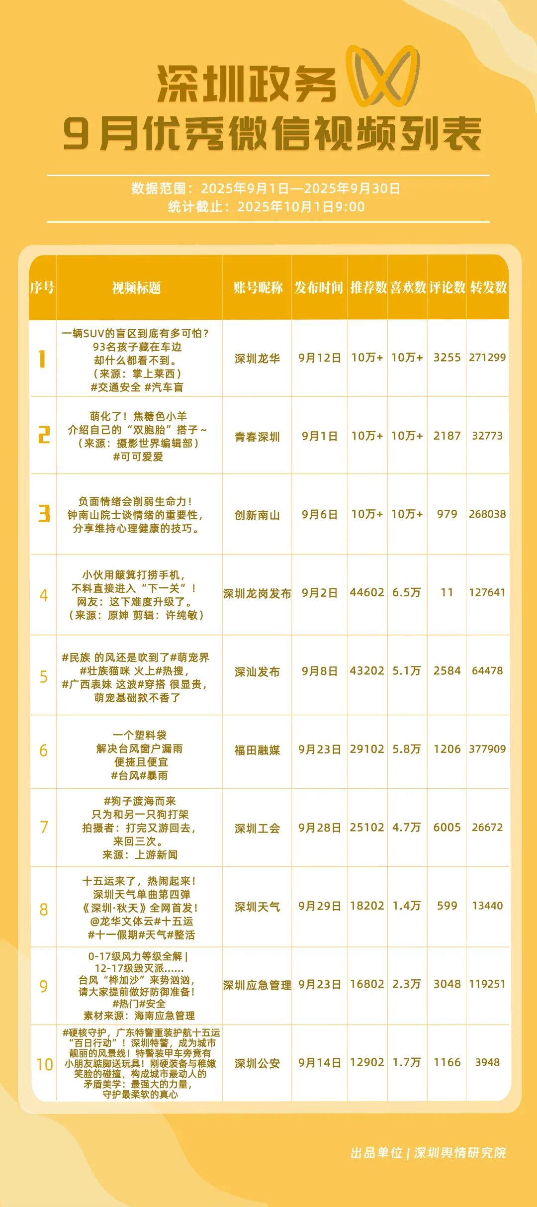 2025年9月期《深圳優(yōu)秀政務(wù)新媒體矩陣》正式發(fā)布,上榜矩陣以精準(zhǔn)高效的傳播策略與前瞻性的創(chuàng)新實踐脫穎而出,不僅為政務(wù)信息傳播樹立了行業(yè)典范,更通過多元內(nèi)容,持續(xù)探索政務(wù)服務(wù)與公眾溝通的新路徑,為深圳政務(wù)新媒體高質(zhì)量發(fā)展注入智慧與力量。