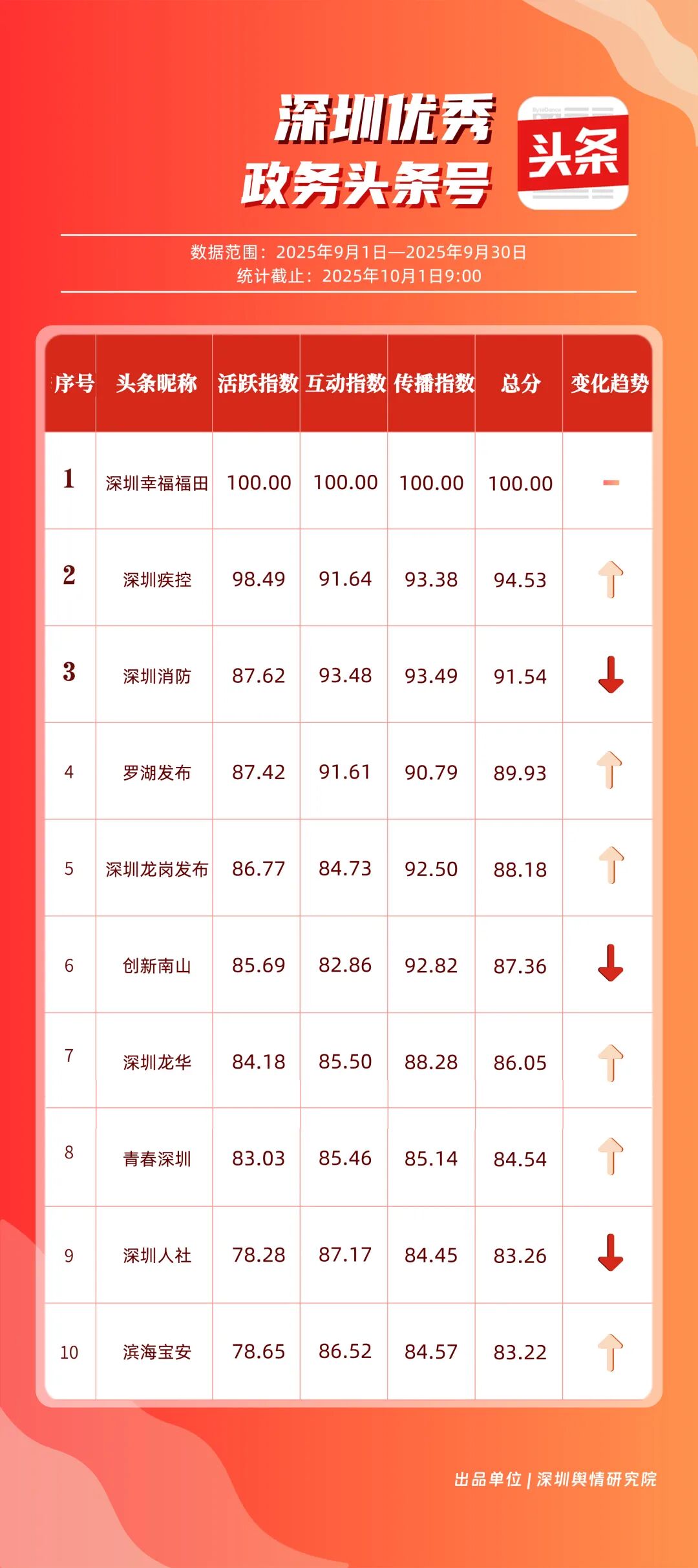 9月,“深圳幸福福田”“深圳疾控”“深圳消防”“羅湖發(fā)布”“深圳龍崗發(fā)布”“創(chuàng)新南山”“深圳龍華”“青春深圳”“深圳人社”“濱海寶安”共10個政務(wù)頭條號入選“優(yōu)秀政務(wù)頭條號”榜單?!吧钲谛腋8L铩狈€(wěn)居榜單首位,在傳播、互動等方面均表現(xiàn)卓越;“深圳疾控”關(guān)注民生健康,有關(guān)“喝茶的好處”“非正規(guī)醫(yī)美針風(fēng)險”兩篇文章閱讀均超10萬次,為市民提供健康信息;“深圳消防”聚焦消防安全領(lǐng)域,提醒市民注意安全。相關(guān)上榜賬號表現(xiàn)優(yōu)異,注重內(nèi)容實用化、互動場景化,彰顯了政務(wù)新媒體的服務(wù)效能。