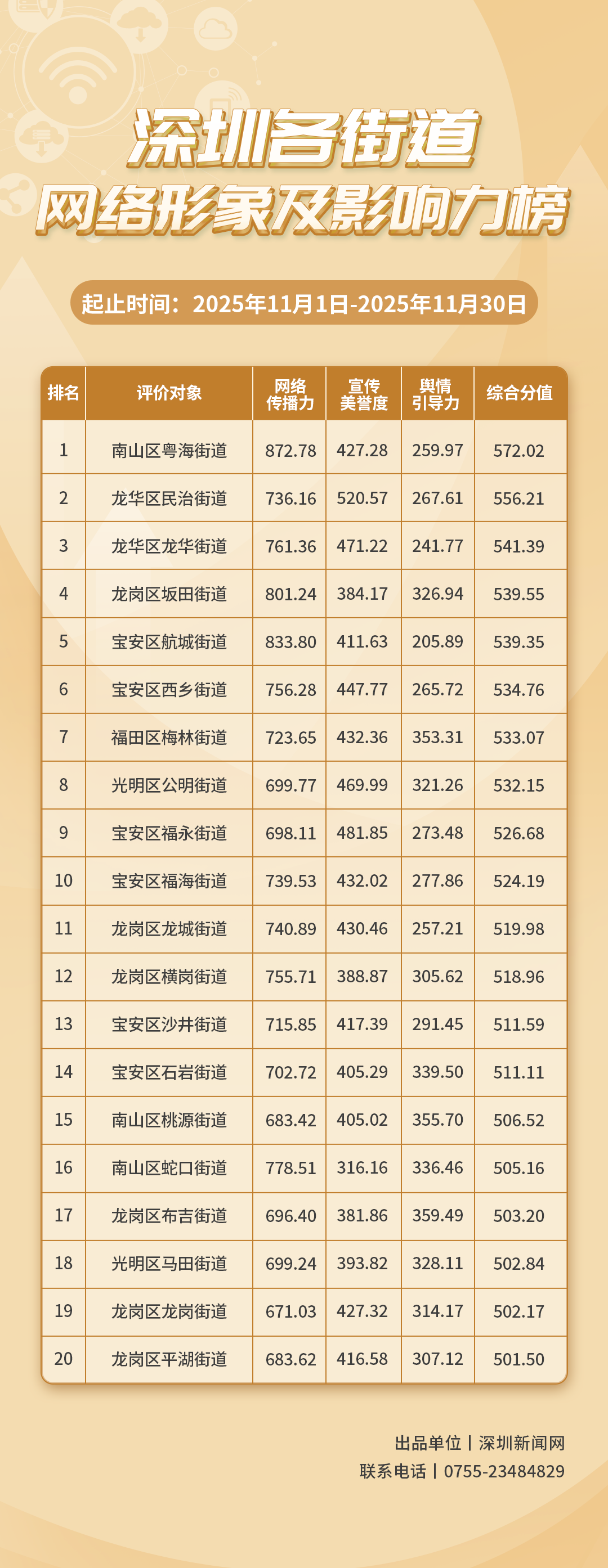 為深入了解深圳市各街道的網(wǎng)絡(luò)形象構(gòu)建狀況和社會(huì)影響,推動(dòng)街道治理“提質(zhì)增效”,增強(qiáng)城市高質(zhì)量發(fā)展動(dòng)能,深圳新聞網(wǎng)編制推出《深圳各街道網(wǎng)絡(luò)形象及影響力榜》。榜單具有獨(dú)立客觀的評(píng)價(jià)體系,通過(guò)數(shù)據(jù)采集和分析,評(píng)估各街道的網(wǎng)絡(luò)傳播力、宣傳美譽(yù)度及輿情引導(dǎo)力,并對(duì)全市11個(gè)區(qū)共78個(gè)街道的網(wǎng)絡(luò)形象及影響力進(jìn)行綜合排名。