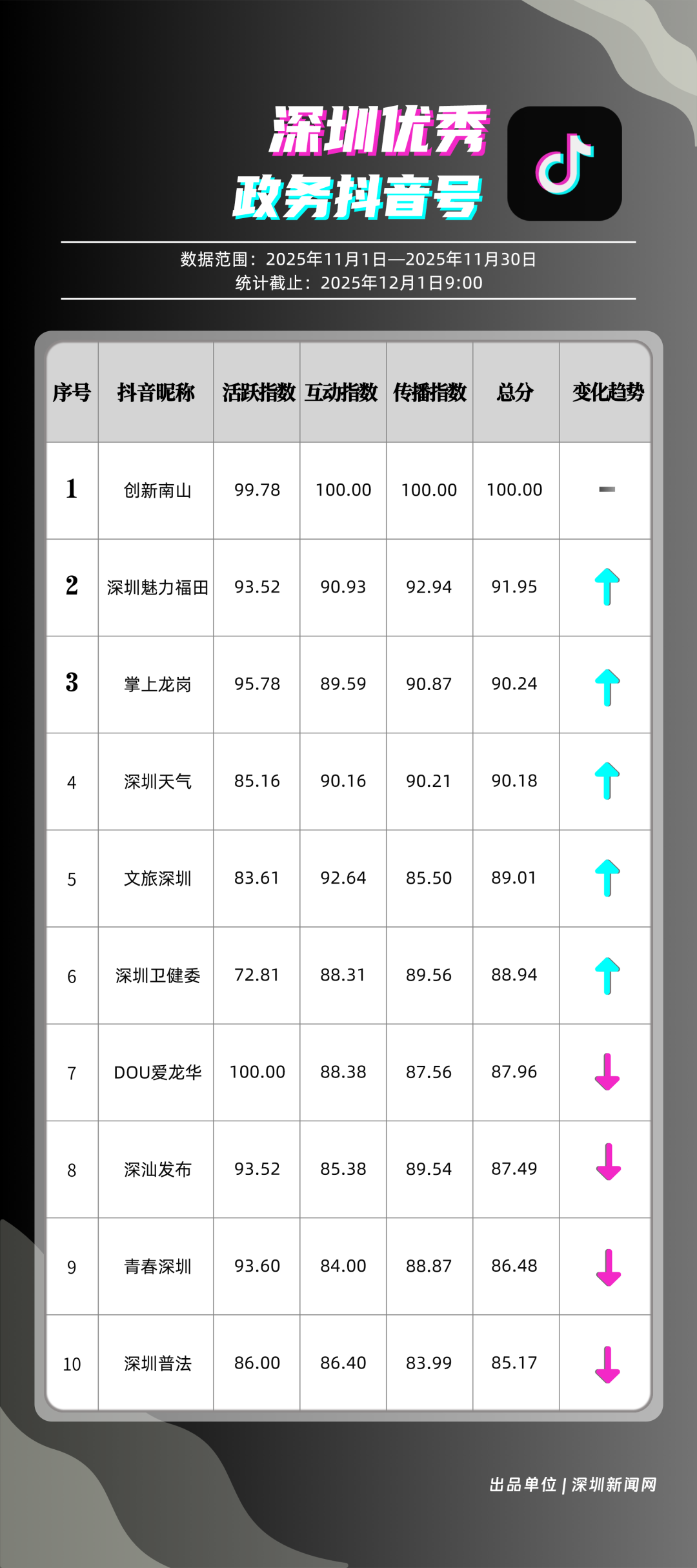 11月,獲得“優(yōu)秀政務(wù)抖音號”稱號的是“創(chuàng)新南山”“深圳魅力福田”“掌上龍崗”“深圳天氣”“文旅深圳”“深圳衛(wèi)健委”“DOU愛龍華”“深汕發(fā)布”“青春深圳”“深圳普法”。“創(chuàng)新南山”多篇文旅、健康及出行相關(guān)內(nèi)容分享超10萬次,在互動、傳播方面表現(xiàn)亮眼,蟬聯(lián)榜首;“深圳魅力福田”在各方面指數(shù)評分較為均衡,位列第二名;“掌上龍崗”在活躍指數(shù)得分較高,能夠較好均衡內(nèi)容數(shù)量與質(zhì)量,位居第三,排名較上期有所提高?!吧钲谔鞖狻薄拔穆蒙钲凇钡荣~號緊隨其后,得分均在90分上下。上榜優(yōu)秀政務(wù)抖音號通過深耕內(nèi)容創(chuàng)作,收獲了高點贊、高分享的傳播效果,也推動評論區(qū)形成正向互動生態(tài),最終以優(yōu)質(zhì)內(nèi)容為核心載體,增強政務(wù)賬號影響力。