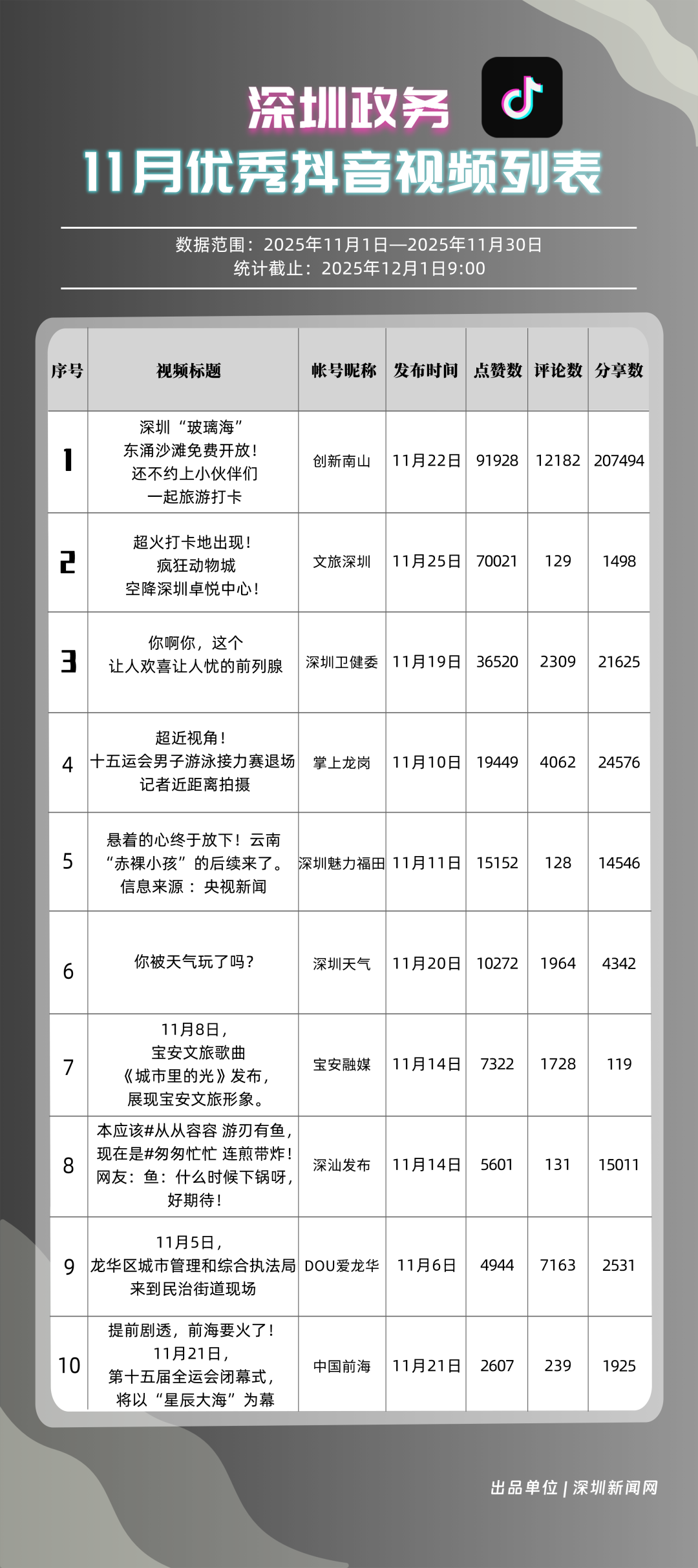 2025年11月期《深圳優(yōu)秀政務(wù)新媒體矩陣》正式發(fā)布,本期上榜矩陣持續(xù)提升傳播效能,通過各類創(chuàng)新實踐在政務(wù)傳播賽道強勢突圍,用“民生關(guān)切+區(qū)域特色”的內(nèi)容創(chuàng)作,攜手構(gòu)建起深圳政務(wù)傳播的新圖景,為政務(wù)新媒體的高質(zhì)量發(fā)展增添新能量。