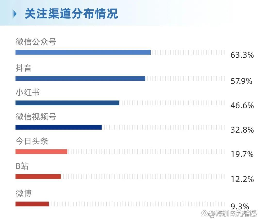 ·整體占比:微信公眾號(hào)(63.3%)、抖音(57.9%)占據(jù)主導(dǎo),小紅書(shū)、微信視頻號(hào)、今日頭條次之,B站(12.2%)、微博(9.3%)占比較低。