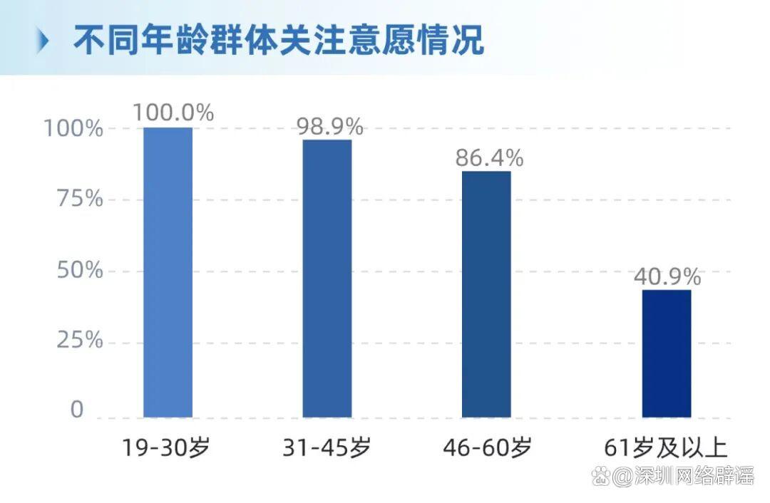 ·年齡差異:19-30歲關(guān)注意愿達(dá)100%,31-45歲為98.9%,46-60歲為86.4%,61歲及以上為40.9%。