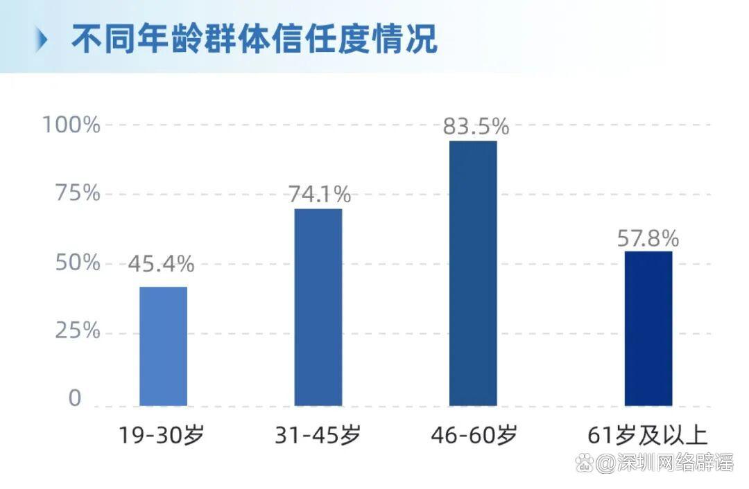 ·年齡差異:46-60歲信任度最高(83.5%),“完全信任”占比46.4%,31-45歲信任度74.1%,61歲及以上信任度57.8%,19-30歲信任度45.4%。