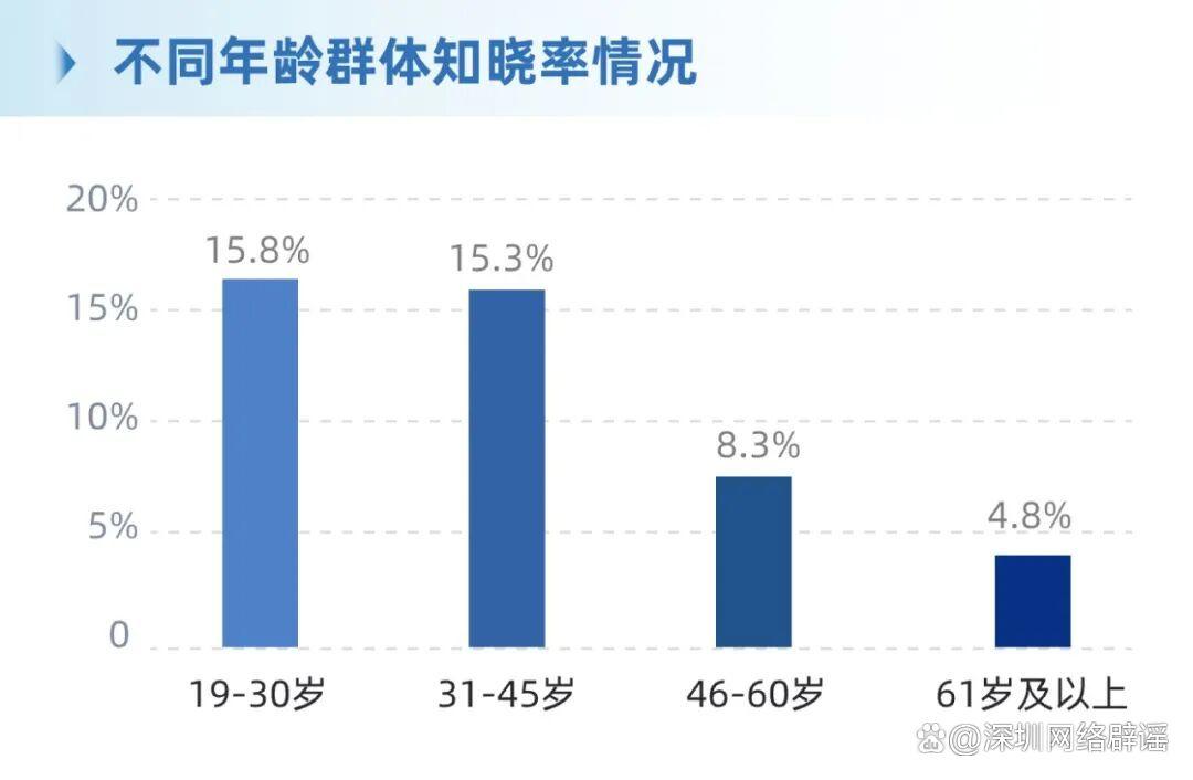 ·年齡差異:19-30歲群體知曉率最高(15.8%),61歲及以上群體最低(4.8%)。