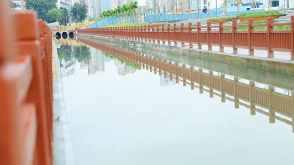走在石圍涌岸邊,看到兩岸新修的朱紅色仿木欄桿與藍天、清水、綠草呼應(yīng),繪就了一幅自然、和諧、美麗的生態(tài)畫卷。