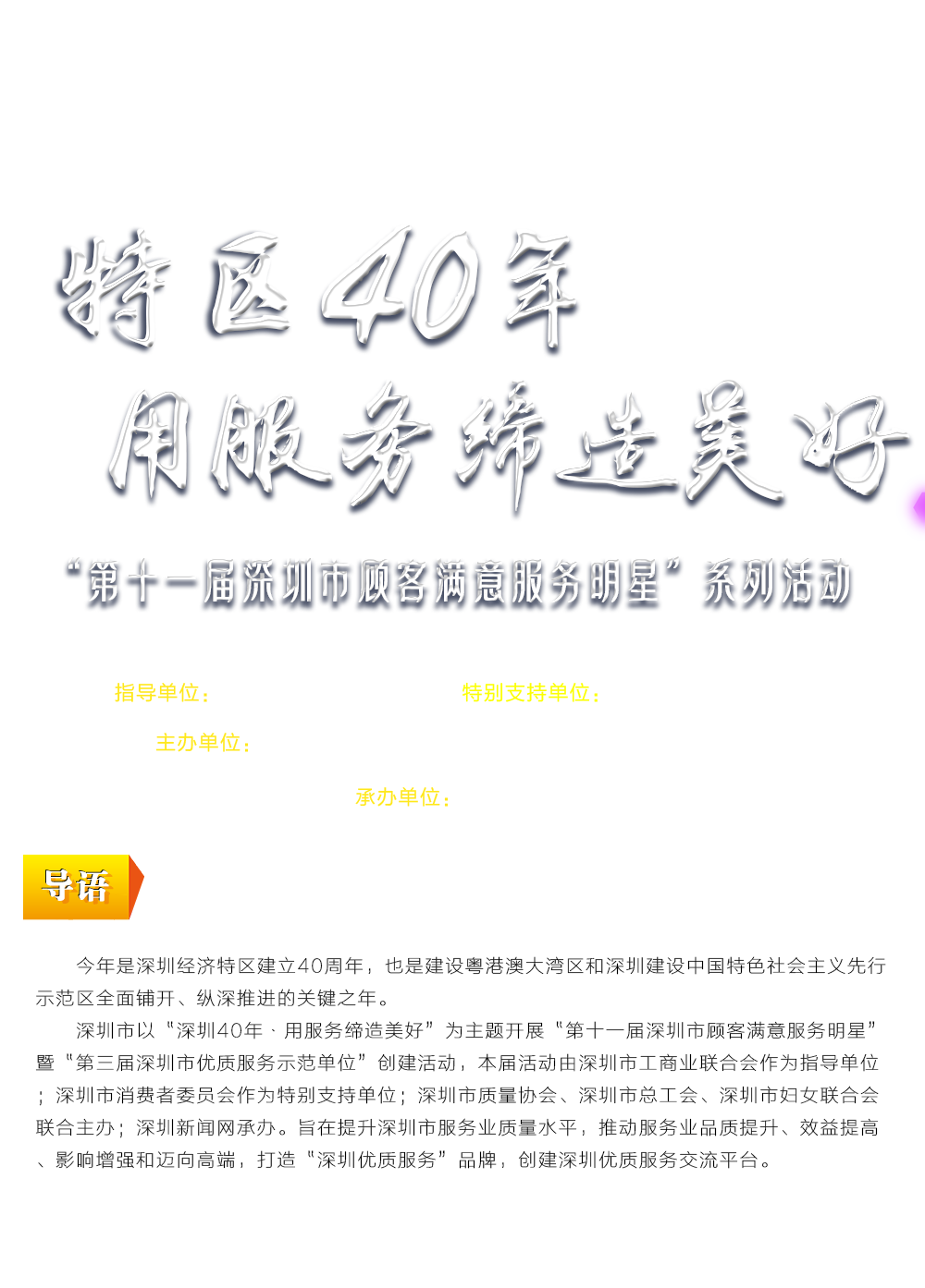 第十一屆顧客滿意服務(wù)明星活動(dòng)現(xiàn)場深圳市政協(xié)常委、深圳市質(zhì)量協(xié)會(huì)執(zhí)行會(huì)長李榕致辭200余人參加第十一屆顧客滿意服務(wù)明星活動(dòng)頒獎(jiǎng)典禮深圳機(jī)場、深圳燃?xì)?、華夏銀行深圳分行榮獲“優(yōu)質(zhì)服務(wù)示范單位”稱號(hào)廣東省深圳市深圳公證處等22家單位獲得“顧客滿意服務(wù)明星單位”稱號(hào)陳傳龍、陳繁華等10位同志獲得“第十一屆深圳市顧客滿意服務(wù)杰出管理者”稱號(hào)“生命之星”班組等50個(gè)團(tuán)隊(duì)獲得“明星團(tuán)隊(duì)”稱號(hào)陳華等70位同志獲得“第十一屆深圳市顧客滿意服務(wù)明星(個(gè)人)”稱號(hào)